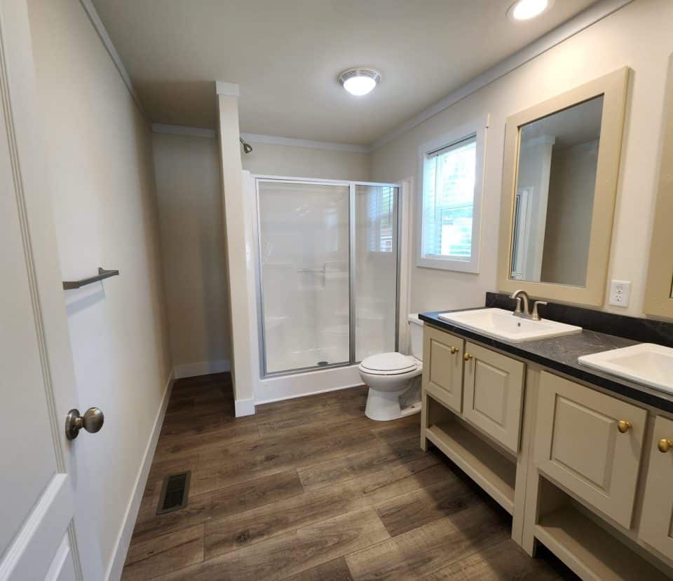 The master bedroom comes with a luxurious en suite bathroom, complete with dual sinks and a spacious walk-in shower, ensuring convenience and relaxation.